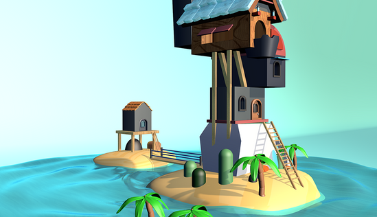 Modelado 3D realizado con Cinema 4D de una casa con varios niveles en medio del océano, se modelaron arboles, sillas, piedras, barriles, cofres, tablas y demás elementos para apoyar la composición para finalmente aplicar materiales a todos los elementos.